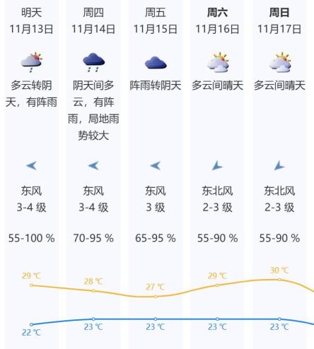 Affected by the peripheral circulation of Typhoon Taozhi, the cloud amount increased from 13th to 15th, with showers and heavy local rain, with the maximum gust of 7-8 on the coast, highland and sea area. Cloudy and sunny on the 16th to 17th.